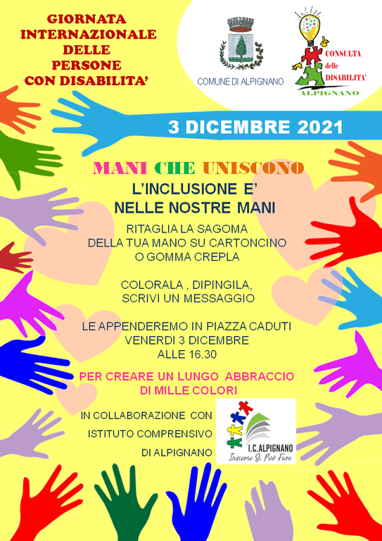 Un'iniziativa organizzata dalla Consulta delle Disabilità Alpignano, in collaborazione con il Comune e l'ICALpignano, per stimolare la riflessione sull'importanza che ogni individuo può avere nel cambio culturale finalizzato ad una reale inclusione. "Mani che uniscono - l'inclusione nelle nostre mani" ambisce proprio a questo, i bambini potranno ritagliare la sagoma delle proprie mani e renderle uniche, affidandogli un messaggio o colorandola. Le mani dei bambini verranno appese intorno alla Cappella dei Caduti il giorno 3 dicembre, per creare un lungo abbraccio di mille colori.