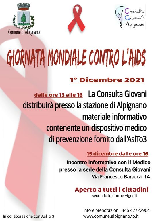 Mercoledì 1 dicembre la consulta giovani distribuirà gratuitamente materiale informativo contenente dispositivi di prevenzione presso la stazione. Un gesto significativo di sensibilizzazione sul tema che culminerà il 15 dicembre insieme ad un medico dell'Asl To3 che terrà un incontro informativo presso la sede della Consulta Giovani in via Baracca, 14. Info e prenotazioni tel. 345.42722964 - www.comune.alpignano.to.it. L'iniziativa è in collaborazione con Asl To3.