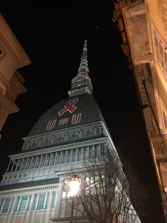 Per due serate, ieri e oggi 1 dicembre, la Città di Torino illumina la Mole Antonelliana con il fiocco rosso, simbolo della lotta contro l’AIDS, e con la scritta “U=U”, dall’inglese “Undetectable = Untransmittable” (cioè “non rilevabile = non trasmissibile”), in occasione della “Giornata mondiale contro l’AIDS” del 1 dicembre.