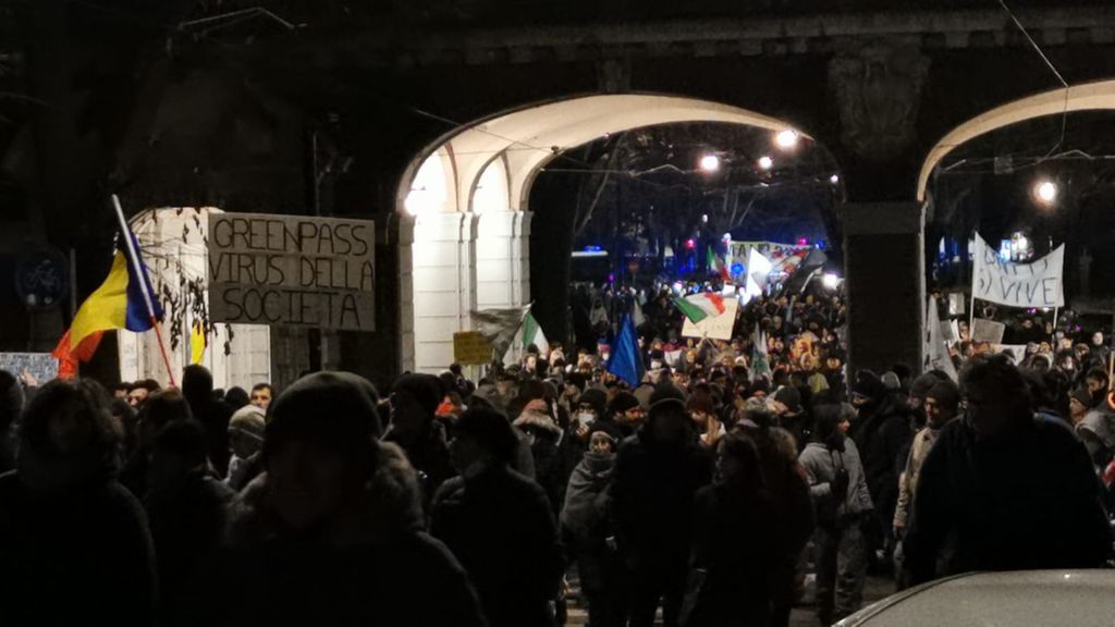 Sono circa un migliaio i manifestanti No Green Pass che oggi pomeriggio hanno sfidato le temperature rigide per ritrovarsi in piazza Castello e sfilare in corteo contro la certificazione verde.