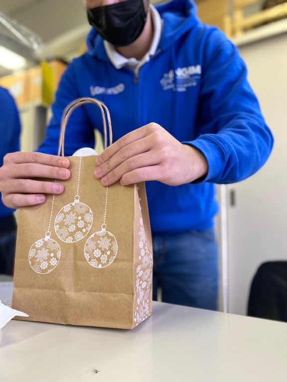 Gli alunni si sono alternati in questa mansione nelle ore di laboratorio e hanno realizzato fiocchi chiudi pacco per lo shop della Fondazione Paideia, confezionato con carta e nastro logato i panettoni della Fondazione Time2 di Torino, e creato le confezioni regalo dell’associazione Ama.Le di Pinerolo e dei baci di dama di An.Lib, sempre di Pinerolo.