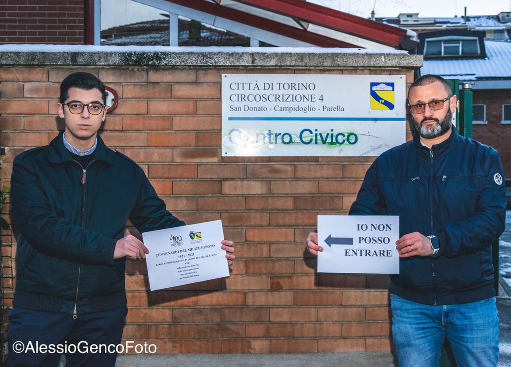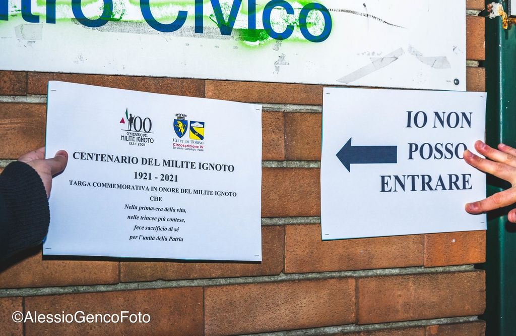 "Dopo il vergognoso Consiglio, in cui la sinistra ha negato la possibilità di apporre una targa commemorativa del Milite Ignoto in occasione del centenario, quest’oggi ci siamo recati presso la sede della Circoscrizione 4 con la targa che avremmo voluto potesse entrare nei locali della sede della nostra Circoscrizione" , dichiarano i Consiglieri di FdI Marascio e Maggia. "Questo non sarà possibile, perché a causa di una votazione scellerata, la targa sarà costretta a stare fuori, come indicato dal cartello che simbolicamente abbiamo portato con noi".