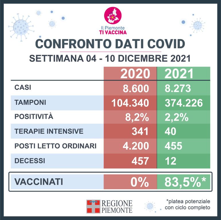 Dal confronto dei dati Covid dell’ultima settimana rispetto allo stesso periodo del 2020 continua a emergere in modo chiaro come l’impatto del virus in Piemonte oggi sia estremamente più contenuto.