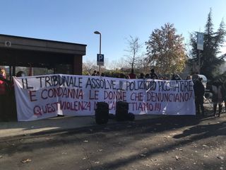"Il Tribunale assolve il poliziotto picchiato e condanna le donne che denunciano. Questa violenza non l'accettiamo", esposto in uno striscione dai manifestanti
