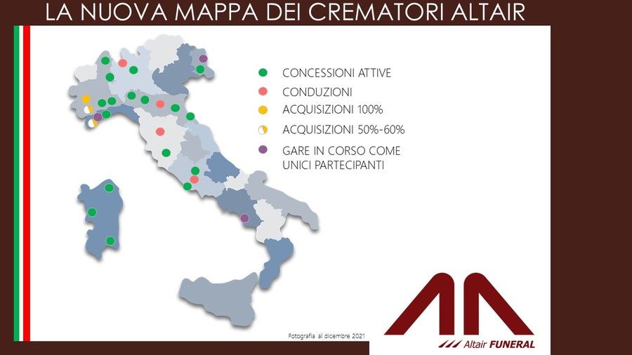 Con questa operazione Altair Funeral consolida la sua leadership nazionale nel settore delle cremazioni con 20 concessioni di impianti crematori distribuite in 8 Regioni italiane.