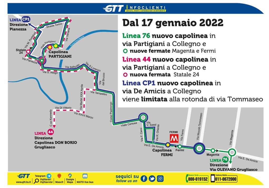 A partire da lunedì 17 gennaio le linee 44, 76 e CP1 della Gtt modificano il capolinea nel Comune di Collegno.