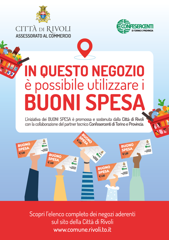 L’Amministrazione Comunale di Rivoli e in particolare gli assessorati al Commercio e alle Politiche Sociali con la collaborazione tecnica di Confesercenti Torino e Provincia propone l’iniziativa dei Buoni Spesa che prevede la distribuzione di buoni spesa a famiglie rivolesi in difficoltà che potranno essere utilizzati nei negozi di vicinato di Rivoli.