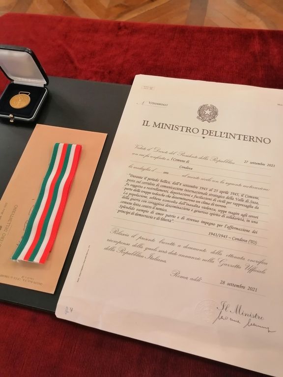 Con questa motivazione il presidente della repubblica Sergio Mattarella - su proposta del Ministro dell'Interno Luciana Lamorgese - ha conferito la medaglia d'oro al merito civile al Comune di Condove.