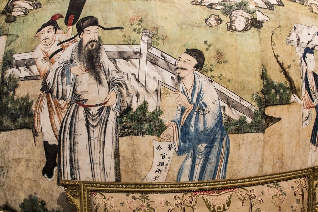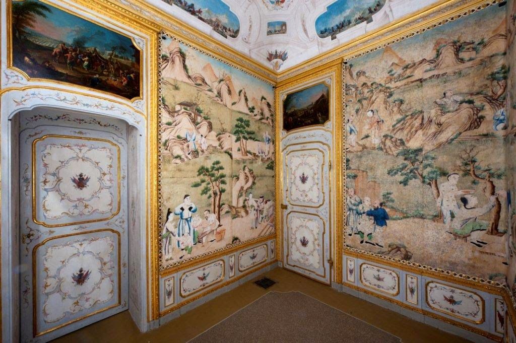 Il fascino dell'Oriente conquista l’Europa a partire dal 1600 con l'arrivo nel Vecchio Continente di merci preziose quali lacche, sete, carte da parati e porcellane che vanno ad abbellire le dimore di re e principi. In Italia, i Savoia, influenzati anche loro dall’esotismo, creano ambienti che riecheggiano questi luoghi lontani. I Gabinetti Cinesi della Palazzina di Stupinigi hanno una tappezzeria di carta dipinta a tempera della seconda metà del Settecento, importata dalla Cina meridionale, che raffigura scene di vita cinese su sfondo roccioso.