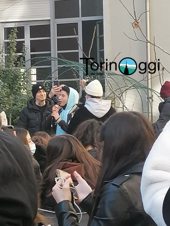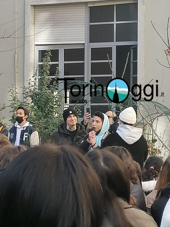 Il rapper ha partecipato a un'assemblea con i ragazzi dell'Istituto Regina Margherita. "Avete un impegno che quelli della mia età non hanno più". Slogan per ricordare Lorenzo Parelli: "È vivo e lotta insieme a noi"