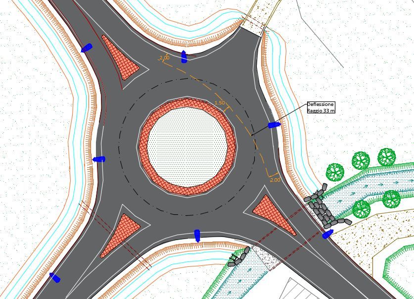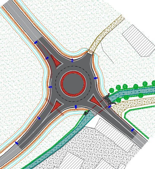 La rotatoria sarà dotata di quattro bracci, di cui due sulla Provinciale 141, uno di innesto su via Circonvallazione e uno per l’accesso alla strada privata a nord della nuova infrastruttura. La strada privata a sud del canale del Molino Osasio non avrà un accesso diretto nella rotatoria, perché in tal caso si dovrebbe prevedere un secondo attraversamento. Si dovranno quindi definire le modalità con cui i mezzi potranno svoltare in immissione e in uscita dalla Strada Provinciale senza compromettere la sicurezza degli altri veicoli. L’immissione sulla Provinciale provenendo dalla strada privata sarà regolata da una segnaletica che prevederà l’obbligo della svolta verso la rotatoria. Il progetto prevede dunque la rotatoria con pavimentazione drenante, la demolizione e la ricostruzione dell’attraversamento della Provinciale 141 sul canale del Molino di Osasio, la realizzazione di muri d’ala in massi ciclopici non legati, un nuovo impianto di illuminazione, l’adeguamento della condotta in cemento armato esistente per lo smaltimento delle acque raccolte nei fossi all’interno del canale irriguo. La carreggiata dell’attraversamento sul canale del Molino di Osasio dovrà essere ampliata dagli attuali 7 fino ad un massimo di 12 metri. In corrispondenza dell’attraversamento dovranno essere installati guard-rail e barriere stradali. Dato che l’attraversamento ha una luce netta complessiva inferiore ai 6 metri il manufatto non viene definito come ponte e pertanto non necessita della verifica di un franco idraulico. Sarà sufficiente verificare che l’attraversamento non vada in pressione in caso di piena. Il nuovo attraversamento in progetto avrà una sezione rettangolare con altezza netta di 1,55 metri e larghezza netta di 5 metri. La superficie netta sarà superiore a quella attuale, garantendo un deflusso maggiore rispetto all’opera presente. Una serie di opere minori serviranno ad evitare fenomeni di erosione e di instabilità delle sponde: muri d’ala in massi ciclopici non legati, una platea antierosiva a valle dell’attraversamento, un dente di fondazione in cemento armato.