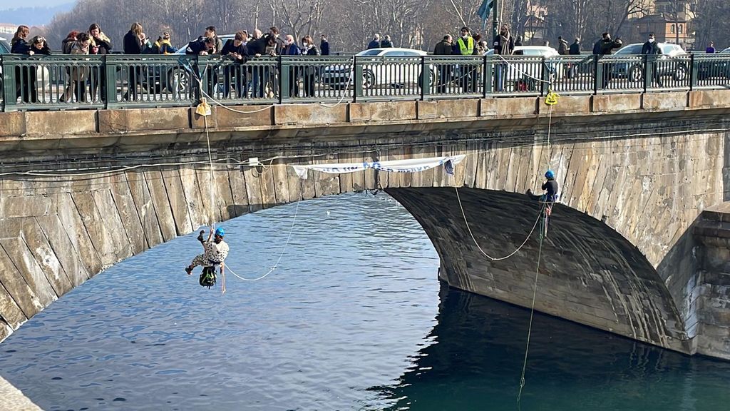Clima: protesta Extinction Rebellion, attivisti si calano sul Po e bloccano la circolazione [VIDEO]