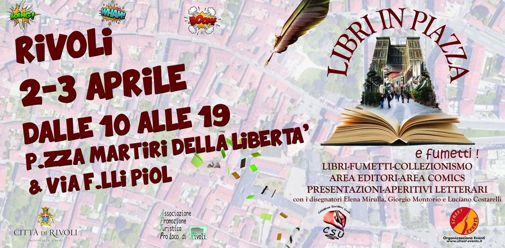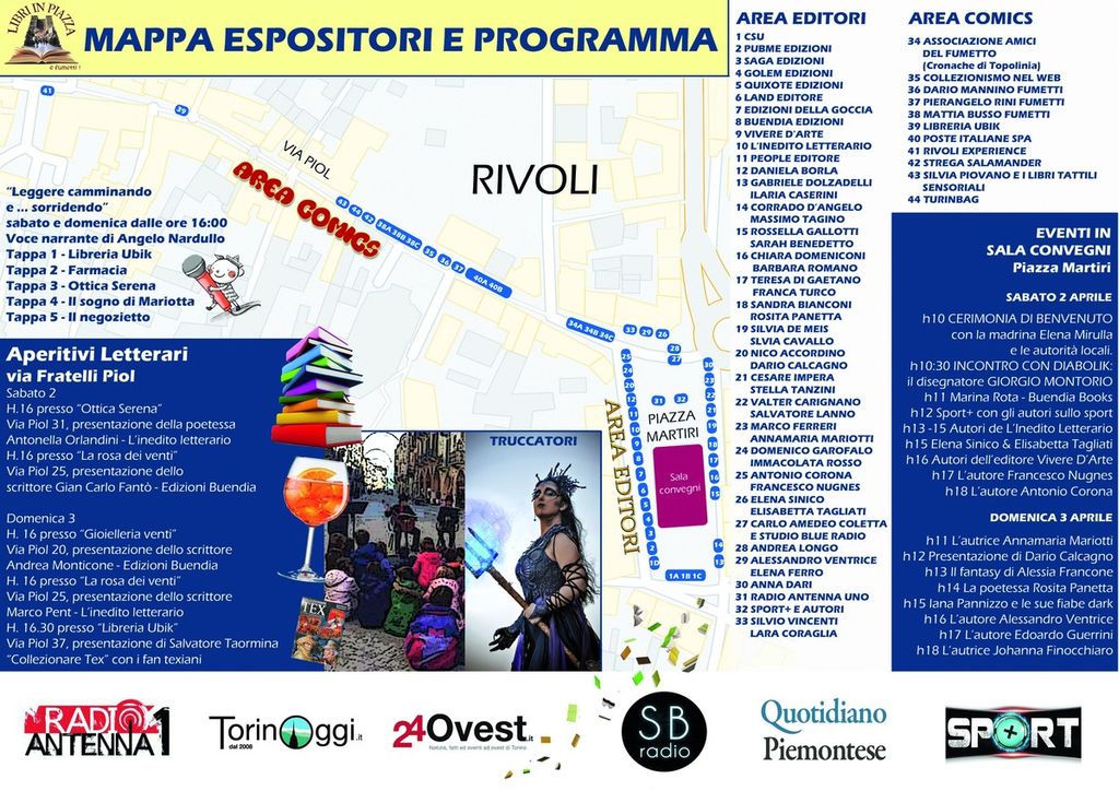 Con il patrocinio del Comune di Rivoli e la collaborazione della Proloco e di Street Events, saranno coinvolti 50 operatori culturali fra editori e fumettisti e oltre 100 autori emergenti e affermati, che daranno vita a una festa culturale nella quale si potrà partecipare a presentazioni, firmacopie, aperitivi letterari, per l'intera durata della manifestazione su entrambe le aree tematiche.