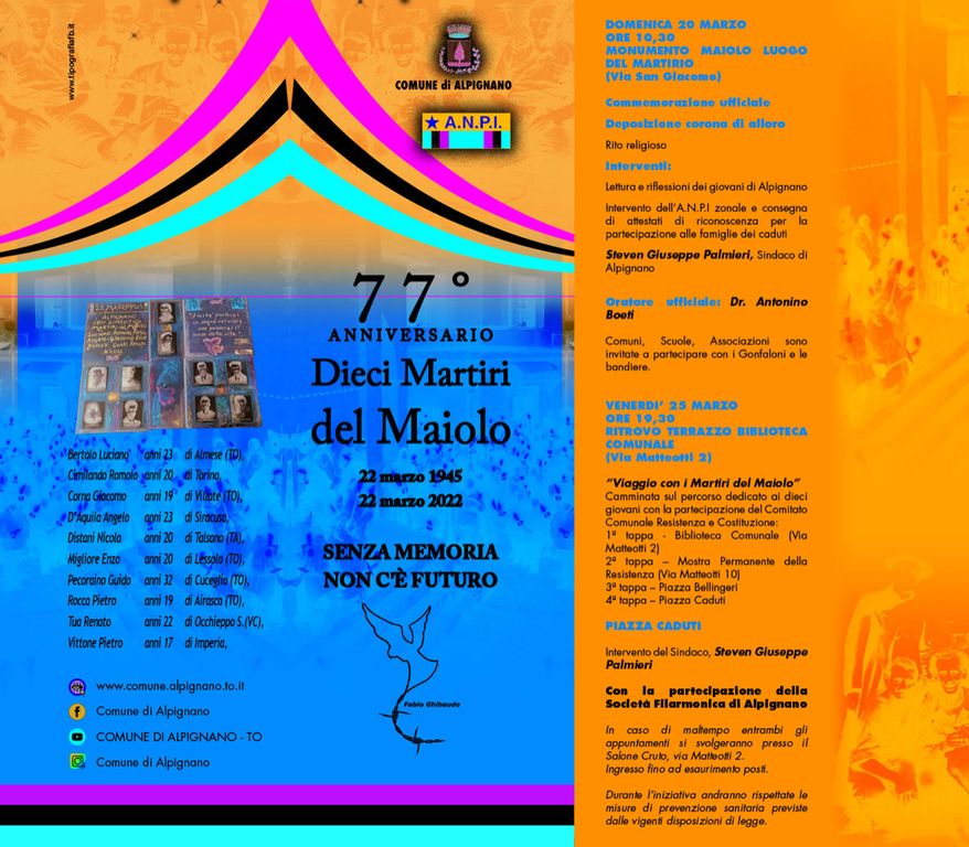 L'amministrazione Comunale di Alpignano vuole celebrare il 77° anniversario dell'eccidio dei “Dieci giovani Martiri del Maiolo”, eccidio che rappresenta uno degli episodi della Resistenza più sedimentato nella memoria collettiva dei cittadini Alpignanesi.