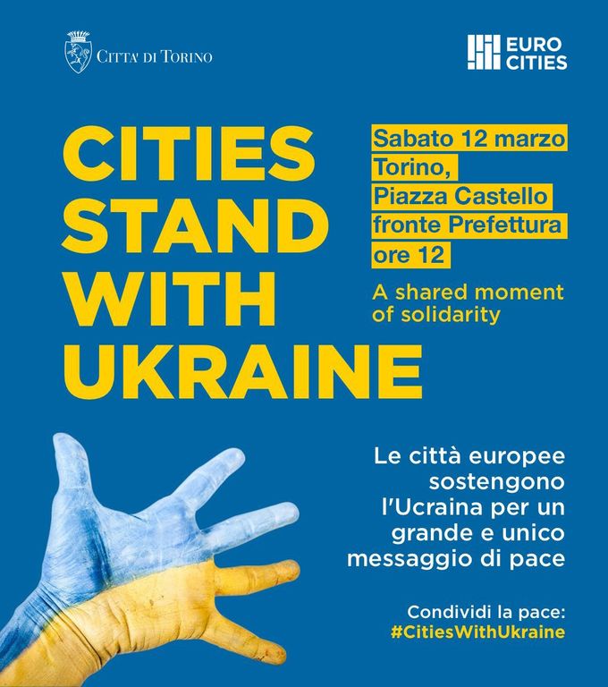 Sabato 12 marzo alle ore 12 la Città di Torino aderirà alla manifestazione delle città europee di Eurocities per dire no alla guerra in Ucraina in piazza Castello (lato Prefettura). “Cities stand with Ukraine” vedrà unite, in un unico momento di solidarietà condiviso, le principali comunità del Continente.