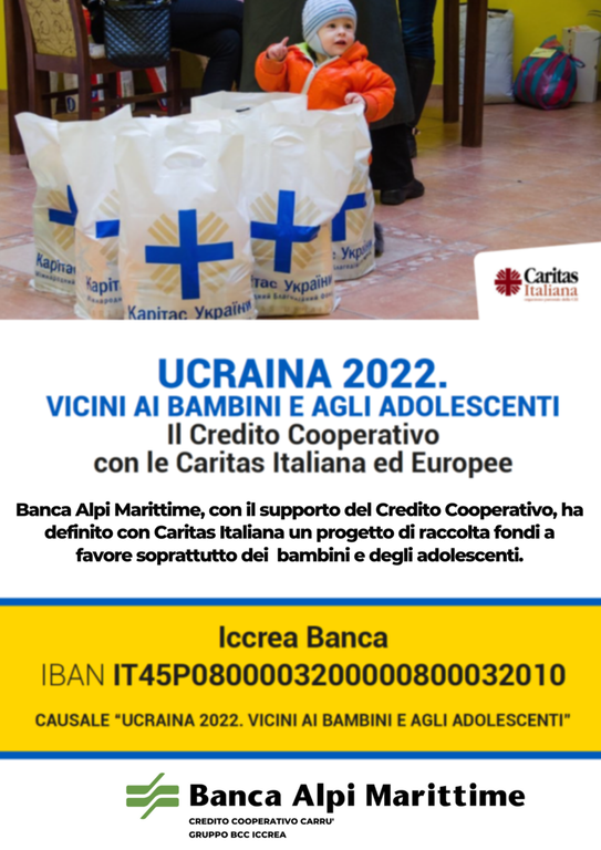 Banca Alpi Marittime, da sempre vicina alle famiglie e alla comunità con il proprio motto “Vicini Sempre”, ha voluto dare un segno concreto di vicinanza alle popolazioni ucraine colpite dalla grave emergenza umanitaria donando 10.000 euro nella raccolta fondi del Credito Cooperativo “Ucraina 2022. Vicini ai bambini e agli adolescenti. Il Credito Cooperativo con le Caritas Italiana ed Europee”.