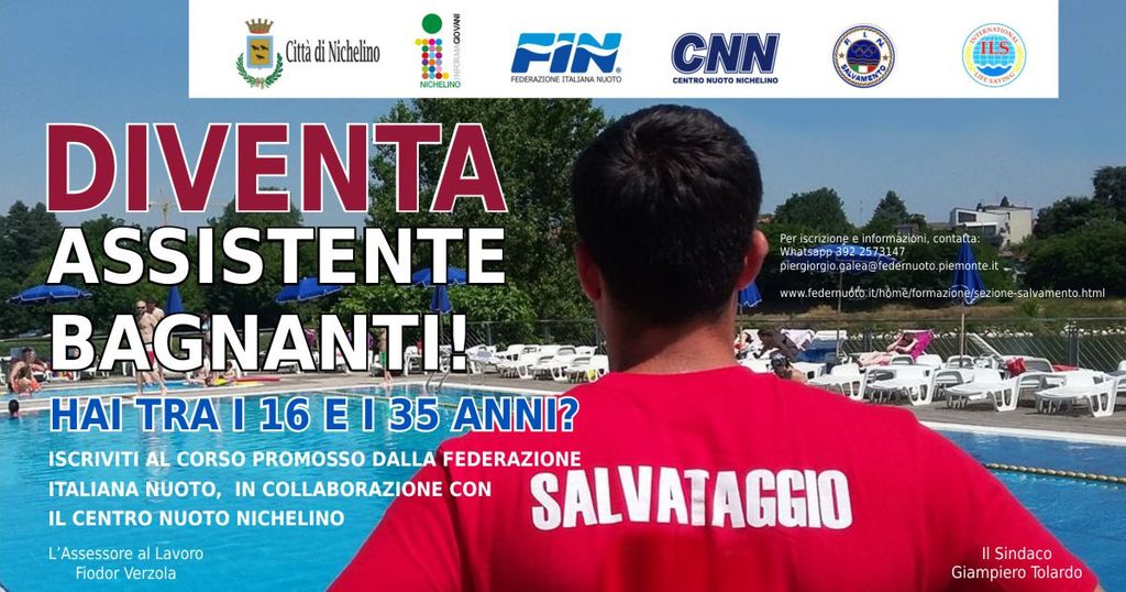 La primavera è alle porte e tra poco si inizierà a pensare anche all'estate. Ed allora il Comune di Nichelino Sta per cominciare il primo dei tre corsi previsti per il conseguimento del brevetto di Assistente Bagnanti, promosso dalla Federazione Italiana Nuoto e realizzato presso il Centro Nuoto Nichelino, destinato a giovani nichelinesi con un'età compresa tra i 16 e 35 anni.