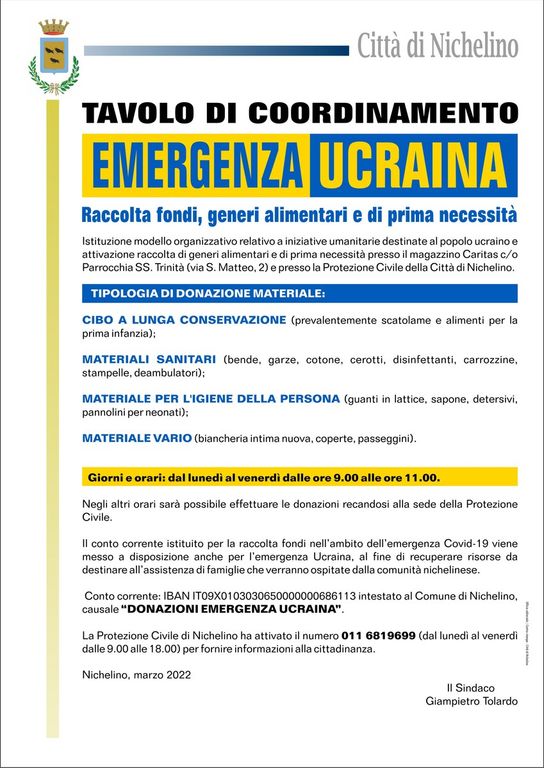 "La situazione tragica della guerra in Ucraina – spiega il sindaco Tolardo, a nome dell’Amministrazione comunale - e la critica condizione umanitaria che sta colpendo la sua popolazione non può lasciarci indifferenti. Per questo, la Città si impegna per offrire sostegno e solidarietà alle tante donne, bambini e anziani che, improvvisamente, si sono visti privare della propria quotidianità. La raccolta di beni di prima necessità e beni alimentari, unita alla raccolta fondi da destinare alle famiglie vittime di questo assurdo conflitto, vuole essere un segno concreto e costante della vicinanza di Nichelino al popolo ucraino".