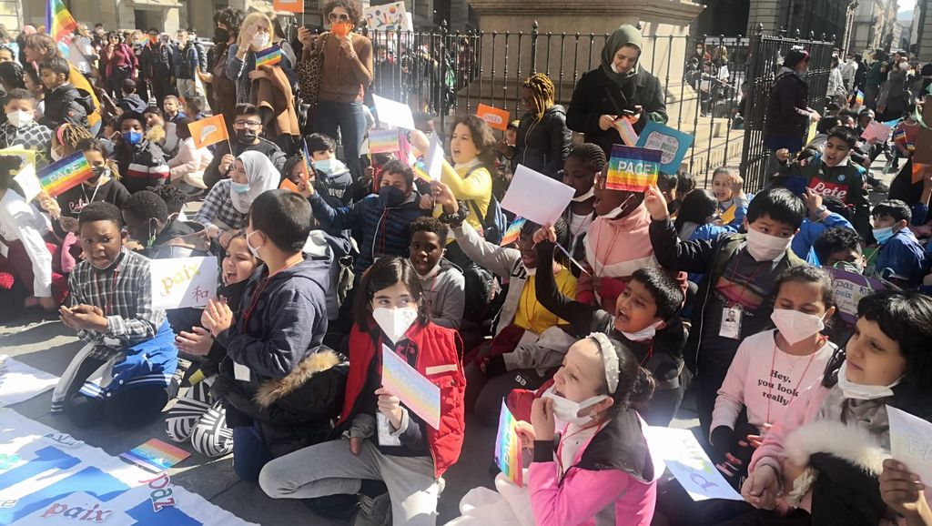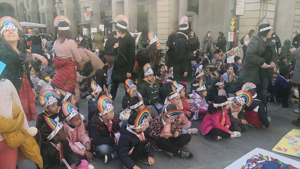 "Pace, pace, pace, pace. E la guerra finirà". È questo lo slogan urlato a gran voce dagli oltre cinquecento alunni, alunne e docenti dell'Istituto Comprensivo To2 di corso Giulio Cesare, che questa mattina hanno dato via ad un sit-in arcobaleno davanti al Comune di Torino per accendere un ulteriore faro sul conflitto in Ucraina.