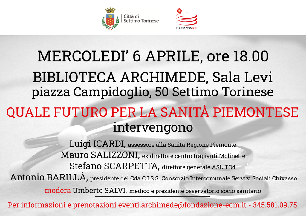 - Mercoledì 6 aprile ore 18 Convegno "Quale futuro per la sanità piemontese" - Sala Levi Biblioteca Archimede con la presenza tra gli altri dell'Assessore Regionale alla Sanità Luigi Icardi (in allegato la locandina)