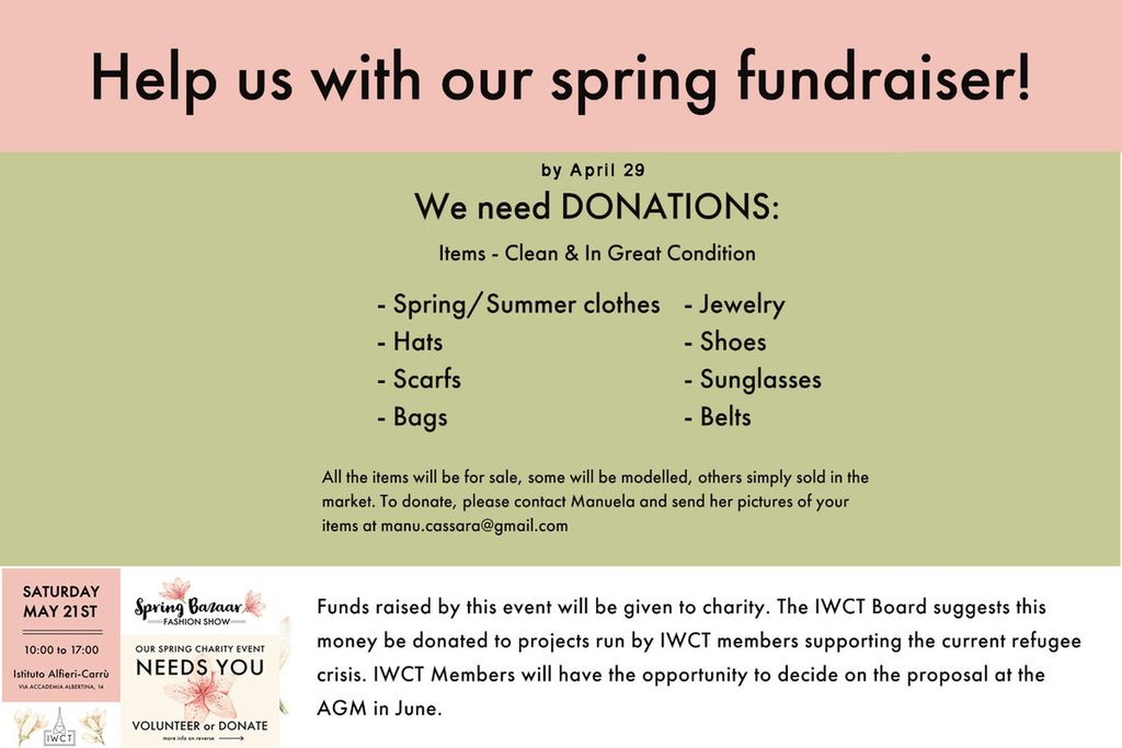 Sabato 21 maggio è in programma il tradizionale evento benefico di raccolta fondi primaverile: un mercatino vintage e una sfilata di abiti donati e indossati dalle signore del Club. "Sarà una giornata dedicata alla solidarietà. Ci sarà un piccolo biglietto d’entrata: 12 euro per i non membri del Club e per amici e parenti sempre ben accolti e 10 euro per le iscritte, che consentiranno di servirsi al Buffet, offerto anch’esso da volontarie", ha spiegato IWCT. "Però, affinché abbia successo, abbiamo bisogno di aiuto".