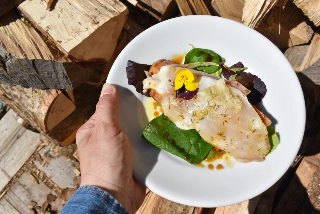- Antipasto di stagione: crostone di pane lievito madre con crema di Tarassaco, Salmerino marinato e burro profumato alle viole.