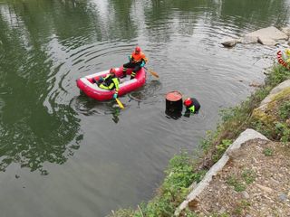 I pompieri impegnati nel recupero di alcuni fusti gettati in acqua