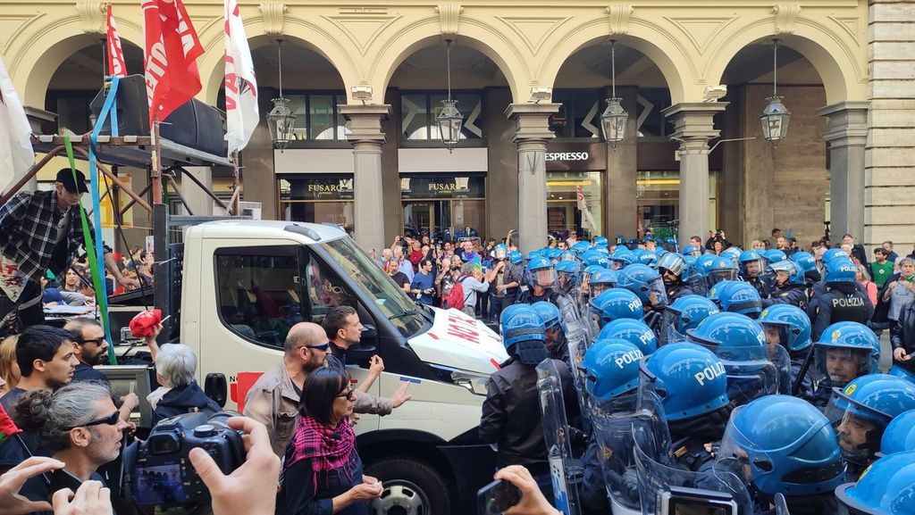 Gli agenti impediscono l'accesso all'area dei comizi alla parte formata da centri sociali, sinistra antagonista, studenti, lavoratori e anarchici