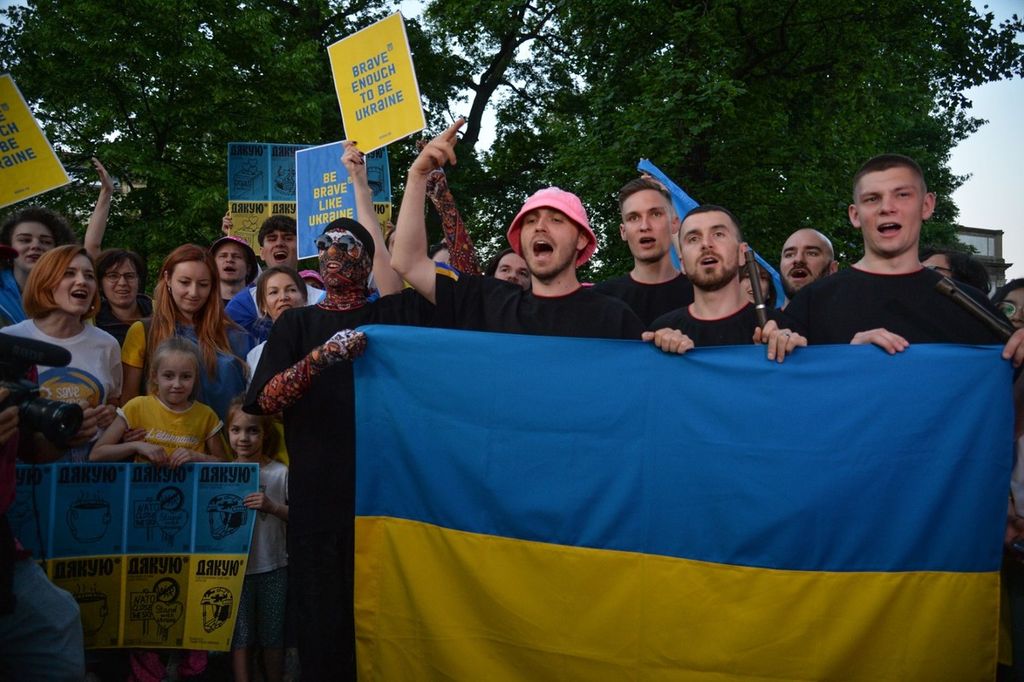 Flash mob con la delegazione ucraina dei Kalush Orchestra all’Eurovillage. I cantanti si esibiranno tra poco sul palco del Valentino insieme ai rappresentanti francesi Alvan & Ahez e i norvegesi SubWoolfer.