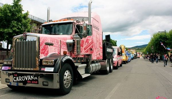 La “Carovana Rosa”, formata da una cinquantina di automezzi, tra cui i famosi truck rosa, precede la corsa di circa 90 minuti, ed incontra sulle strade il pubblico che attende il passaggio degli atleti, intrattenendo con spettacoli, musica, balli e gadget e coinvolgendo così la cittadinanza nella grande festa che è il Giro d’Italia.