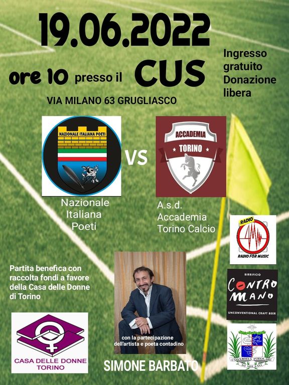 La Nazionale Italiana Poeti sarà a Torino domenica 19 giugno al Cus di Grugliasco per unire come sempre calcio, beneficenza e cultura. Il ricavato sarà totalmente destinato alla Casa delle Donne Torinoavversaria sarà la prima squadra femminile dell' Accademia Torino FC .