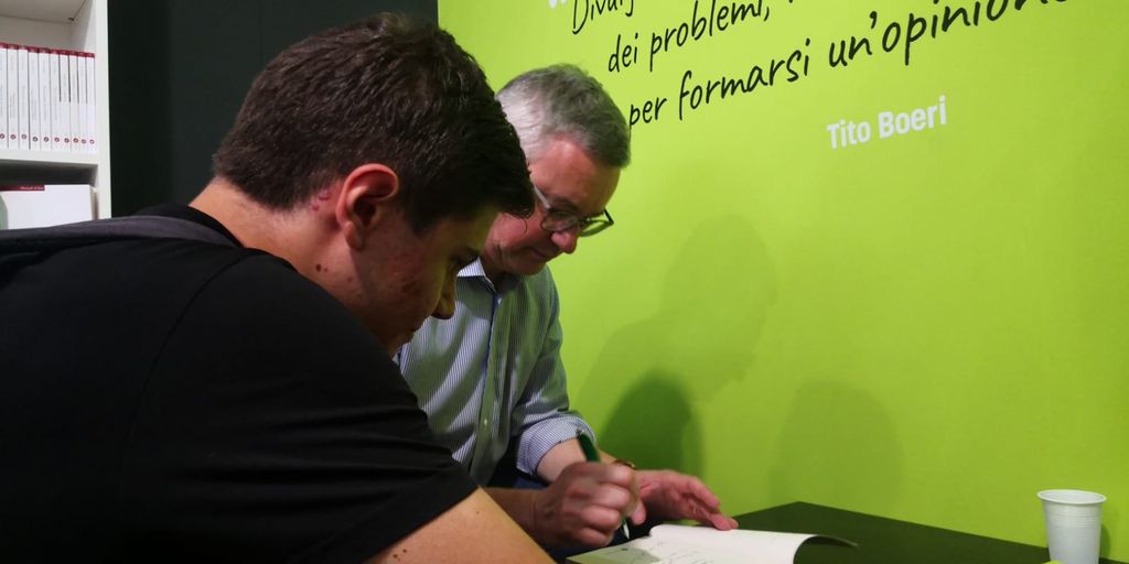 Lo storico, dopo la presentazione, si è seduto nello stand della casa editrice per il firmacopie. E sono moltissimi i fans, da ragazzi delle superiori a signora di mezza età, che pazientemente hanno atteso il loro turno per ottenere il suo autografo o una foto insieme.