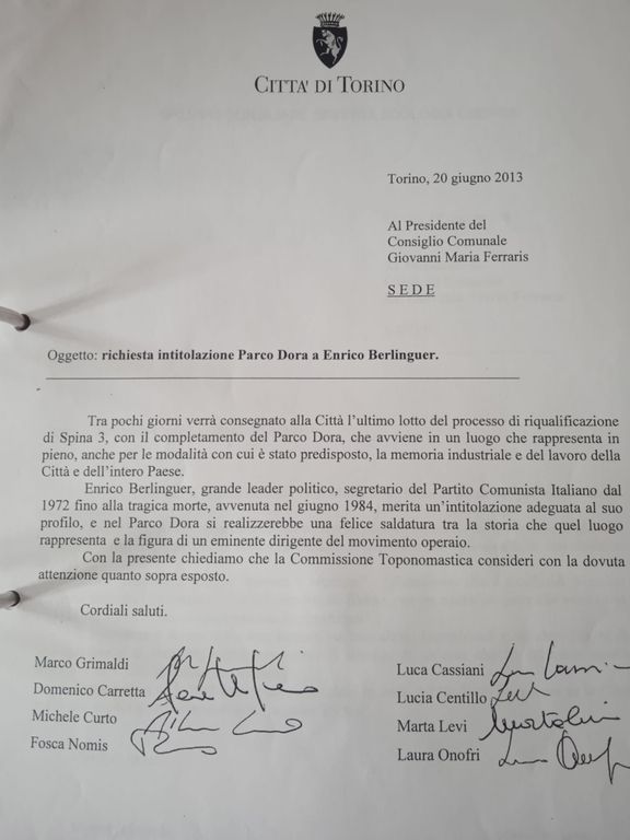 “Quella di far diventare ‘Parco Enrico Berlinguer’ l’area posta nell'esoscheletro dello strippaggio fu una delle ultime proposte che – come primo firmatario insieme a tanti colleghi e colleghe – chiesi e ottenni in sede di Commissione Toponomastica”, prosegue il Capogruppo in Regione di Liberi Uguali Verdi ed esponente di Sinistra Ecologista, Marco Grimaldi. “È un atto a cui tengo molto perché, come scrivemmo allora nella delibera, Berlinguer ‘merita un’intitolazione adeguata al suo profilo’ di uomo e leader politico impegnato ogni giorno per costruire ‘una società che rispettasse tutte le libertà meno una: quella di sfruttare il lavoro di altri esseri umani’, ma anche perché ‘nel Parco Dora si realizzerebbe una felice saldatura fra la storia che quel luogo rappresenta e la figura di un eminente dirigente del movimento operaio”.