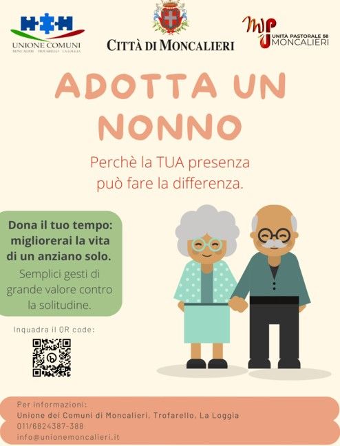 Ed allora il Comune di Moncalieri ha dato il via all'iniziativa 'Adotta un nonno", una campagna di sensibilizzazione e solidarietà ideata in collaborazione con le parrocchie della Città e l'Unione dei Comuni di Trofarello e La Loggia.