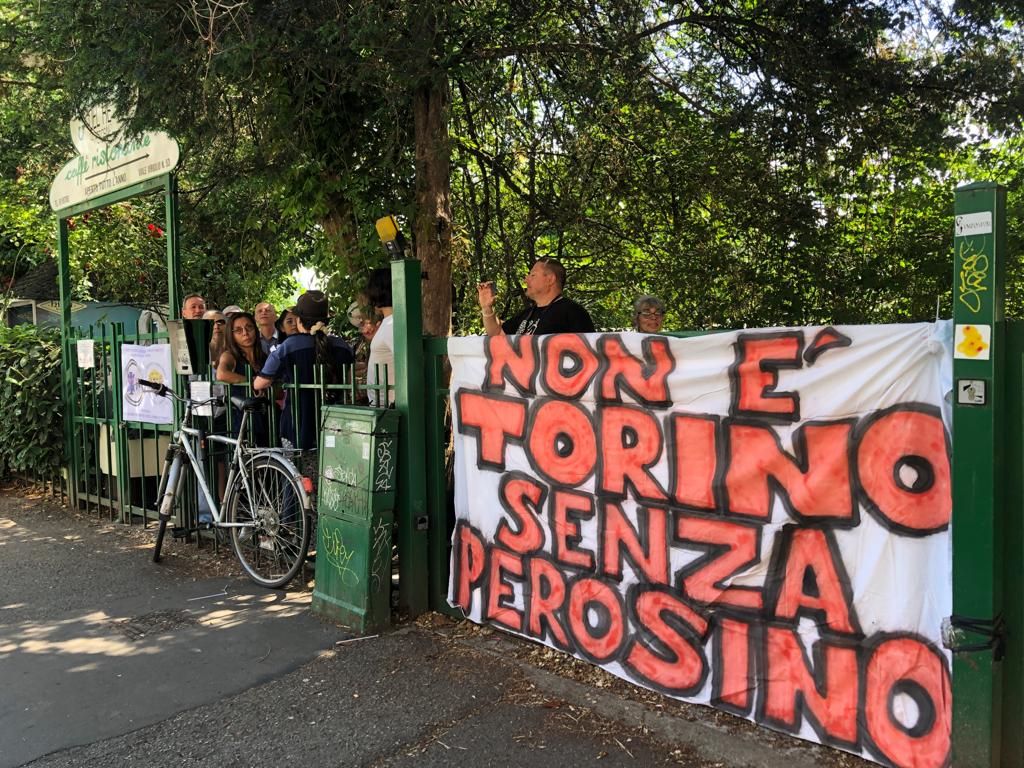 La marcia indietro delle forze dell’ordine di fronte alle numerose persone che si sono assembrate dietro i cancelli dello storico locale sul Po per impedire lo sgombero della famiglia Perosino e la chiusura dell’Imbarco.