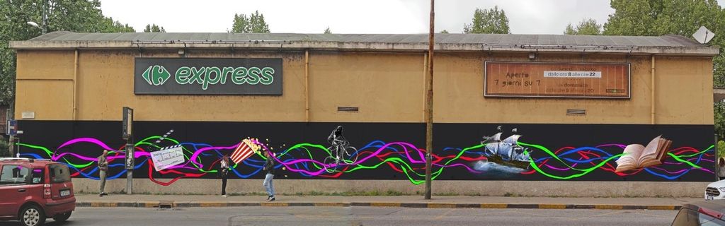 Vito Navolio, Margherita Bobini ed Andrea Gritti - hanno realizzato il lavoro sulla parete esterna del supermercato Carrefour di corso Casale 115. Il murale, con toni vivaci e colorati, vuole raccontare la storia di Madonna del Pilone.