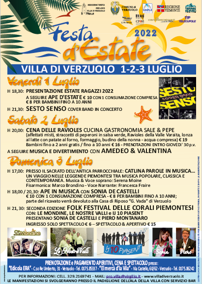 La festa d’estate va a valorizzare le nostre tradizioni sia culinarie che musicali, grazie alla collaborazione con l’amministrazione e altre realtà verzuolesi verranno coinvolti nella manifestazioni i bambini e ragazzi ed anche il sostegno alla preziosa Casa di Riposo, tre serate di divertimento e buona cucina con i prodotti del territorio alle quali siete tutti invitati” il commento del direttivo Pro Loco