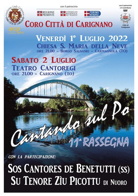 Per gli amanti del bel canto un doppio appuntamento da non perdere in provincia di Torino. L'undicesima edizione della rassegna "Cantando sul Po" vedrà protagonisti i componenti di due cori sardi di assoluto valore: gli Sos Cantores de Benetutti di Sassari, gruppo nato nel 2007composto da una ventina di persone, ed il quartetto dei Tenore Ziu Picottu di Nuoro.