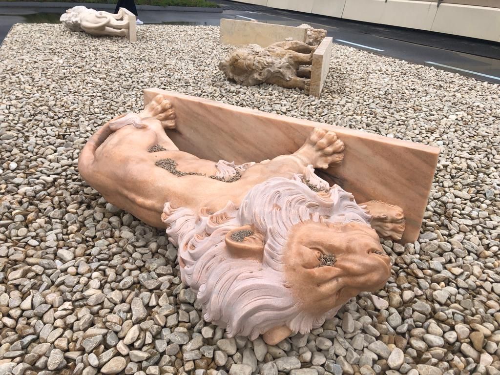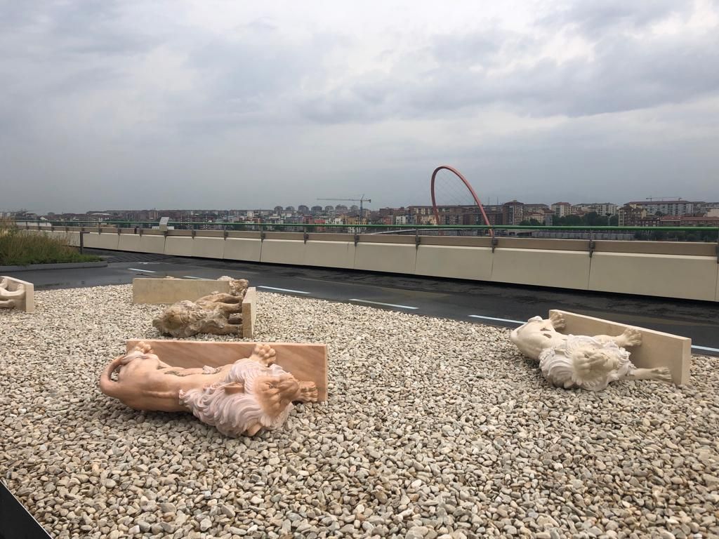 Realizzati pensando alle varie declinazioni dell’iconografia del leone nella storia e nelle varie culture, da quella della Repubblica di Venezia a quella Cinese, fino all’accezione più pop legata al mondo Disney, i leoni di Nina Beier richiamano al mondo naturale con veri semini sparsi sulle sculture stesse e che vogliono attrarre gli uccellini sul tetto del Lingotto.