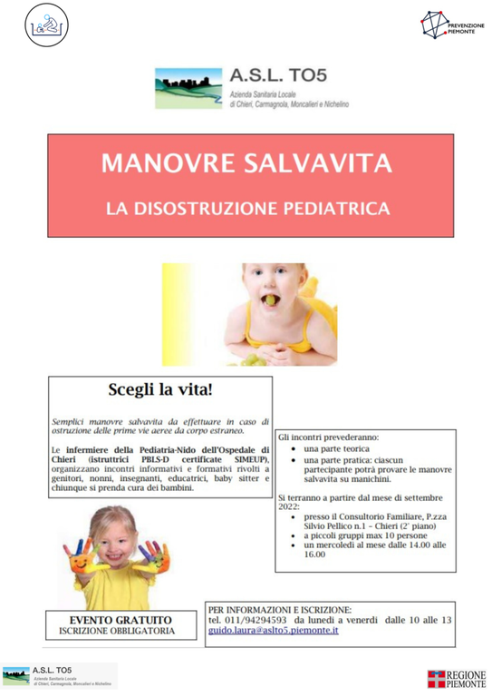 L'iniziativa sarà attuata a settembre anche a Carmagnola presso i locali Day Service Pediatrico dell'Ospedale San Lorenzo. Saranno trattati, oltre ai temi della disostruzione pediatrica, anche quelli della promozione della salute del cavo orale, la prevenzione delle carie e l'introduzione dei cibi solidi durante lo svezzamento.