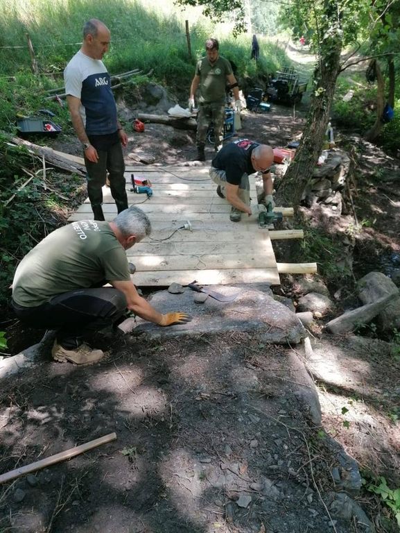 “Come associazione, operiamo spesso in sinergia con il Comune, che ci ha offerto la sede assieme alle altre associazioni, nei locali sopra alle scuole, e si occupa di pagarne le utenze, quindi svolgiamo interventi di manutenzione – spiega il capogruppo Marco Breusa –. In questo caso, forse anche a causa delle piogge forti negli anni passati, e con il passare del tempo, la struttura aveva ceduto completamente, il ponticello proprio non esisteva più, ed abbiamo anche dovuto ripristinare la ‘spallina’ sul versante di Perrero, per poi appoggiarci le assi”.