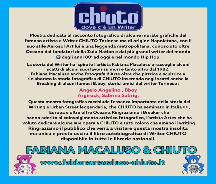 Fabiana Macaluso dichiara: “Sono molto onorata di aver collaborato a questa mostra personale di Writer CHIUTO perché è un grande artista e raccontare una parte della sua vita in una galleria e stato emozionante e ringrazio anche i ballerini della Breaking Sabrina Sabrig, Angelo Angelino e Bboy Argirock per aver fatto parte con la loro immagine in questi scatti con delle danze stupende grandi ballerini e storici Breaker.