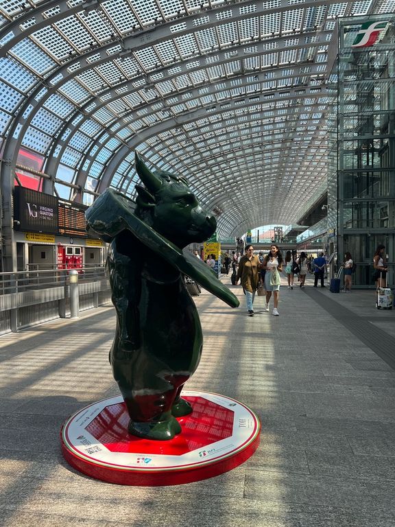Prima di Porta Nuova, la simpatica scultura ha fatto tappa temporanea ed è ancora presente a La Rinascente, al Museo del Risorgimento, alle OGR.