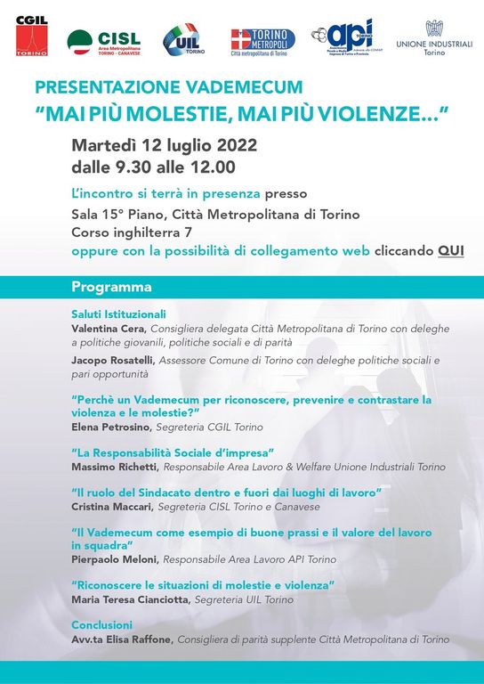 Ecco perché la lotta alle molestie e alle violenze di genere possono passare anche da poche, chiare regole. Come il vademecum che Cgil, Cisl e UIL hanno deciso di promuovere insieme alle sigle datoriali delle grandi (Unione Industriali) e piccole imprese (Api Torino). E che in autunno sarà presentato in molti contesti e occasioni a Torino e provincia. "Vogliamo accendere una lampadina - dice ancora Maccari - per stimolare una sensibilità che arrivi anche agli episodi di violenza domestica".