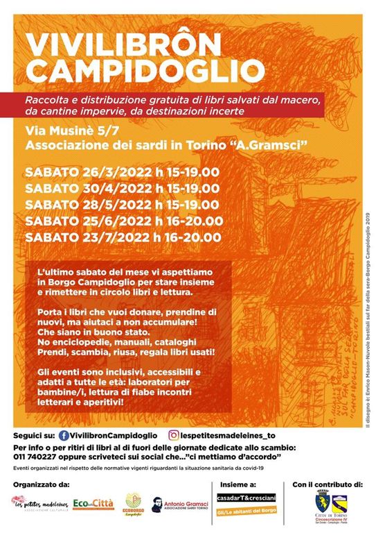 Il sistema è semplice: si mettono a disposizione gratuita i volumi recuperati oltre alla possibilità di partecipare in prima persona scambiando libri con gli atri presenti nella lunga tavolata allestita in via Musinè davanti dall'Associazione sardi Gramsci. L'appuntamento è sabato 23 luglio dalle ore 16 nell'area pedonale di via Musinè dove oltre allo scambio dei libri ci saranno momenti di incontro con letture, laboratori per bambini e aperitivi.
