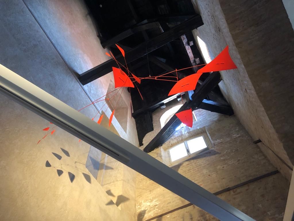 E così ecco alternarsi Il grande mobile rosso di Alexander Calder, in prestito dalla Gam e posto sul soffitto che si confronta con Gris la platform adventure game di Nomada Team.