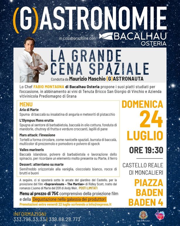 Protagonista l’ingrediente più rappresentativo della cucina di Fabio Montagna: il baccalà, per un inedito viaggio in punta di forchetta in cui il pregiato merluzzo islandese incontrerà la geografia e le atmosfere di Marte. A seguire, ci si sposterà sotto le arcate del giardino del Castello, per la proiezione del film "Sopravvissuto – The Martian" di Ridley Scott, tratto dal romanzo L’uomo di Marte del 2011 di Andy Weir.