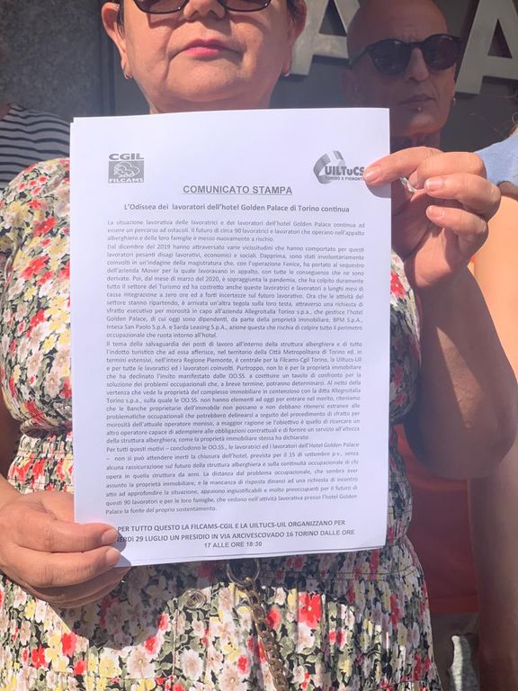 La situazione lavorativa delle lavoratrici e dei lavoratori dell'hotel Golden Palace di Torino continua ad essere un percorso ad ostacoli. "II futuro di circa 90 lavoratrici e lavoratori che operano nell'appalto alberghiero e delle loro famiglie è messo nuovamente a rischio", sottolineano i sindacati che nel pomeriggio di oggi, venerdì 29 luglio, hanno organizzato un presidio in via Arcivescovado, all'esterno dell'albergo.