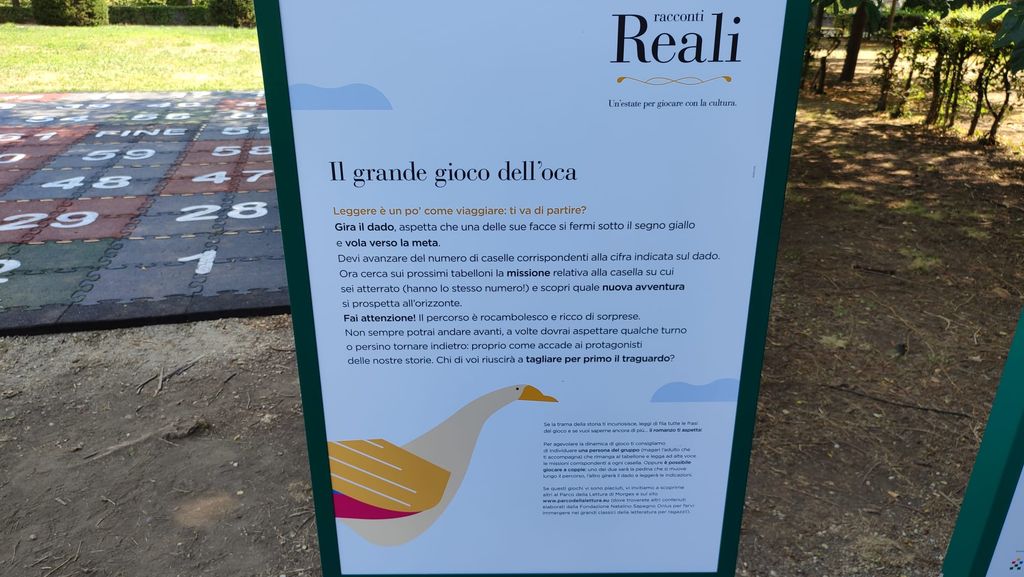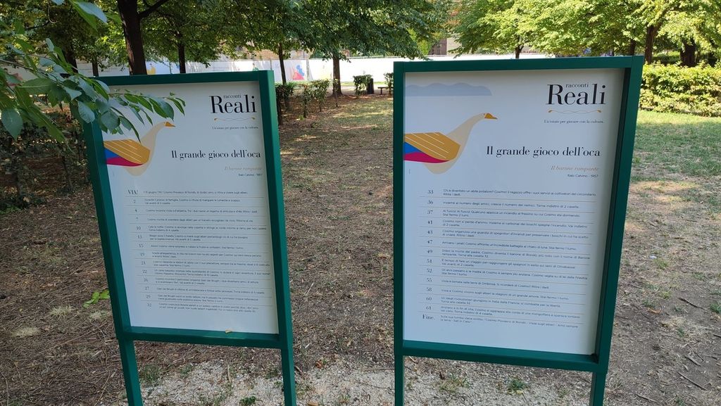 Una delle attrazioni più divertenti è sicuramente rappresentata dal grande Gioco dell'Oca umano ispirato al libro “Il barone rampante” di Italo Calvino, dove grandi e piccoli potranno sfidarsi a vicenda e affrontare la sorte girando il dado gigante e guidando il protagonista Cosimo lungo le missioni che lo porteranno al traguardo. Da non perdere nemmeno il “labirinto letterario”, dal quale uscirà solamente chi indovinerà il corretto significato delle parole proposte; a questo si aggiungono letture e spettacoli a ingresso libero e gratuito. Racconti Reali proseguirà fino al 21 settembre, dal martedì alla domenica con orario 10-19 con ingresso dai Musei Reali o da viale 1° Maggio.