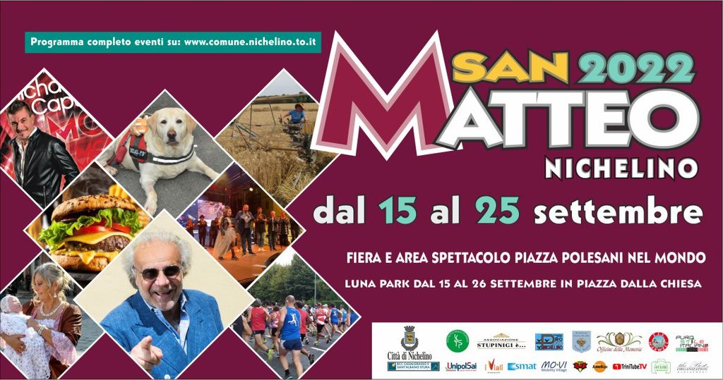 Dopo le limitazioni imposte dall'emergenza Covid nelle ultime due edizioni, Nichelino scalda i motori per il ritorno a pieno regime della festa di San Matteo, i dieci giorni in cui la Città rende omaggio al suo santo patrono. Dal 15 al 25 settembre in programma appuntamenti ed eventi per tutti, dalla musica allo sport, dal cibo alle celebrazioni religiose.